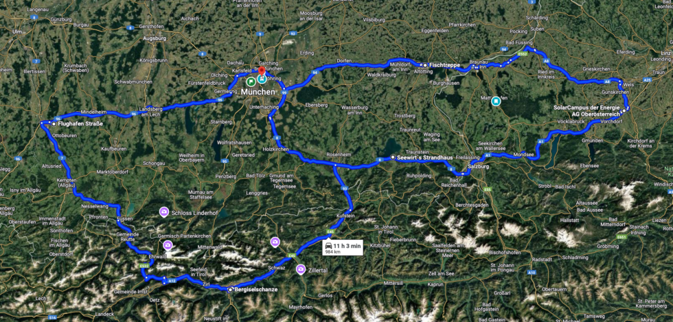 Auf der ersten 500km-Schleife in Richtung Westen und Süden mussten die Wegpunkte Memminger Flughafen und die Bergiselschanze in Innsbruck angefahren werden. Das zweite Teilstück führte dann von München aus nach Osten über Südostoberbayern, Oberösterreich, das Salzkammergut und dem Chiemgau wieder zurück nach München.